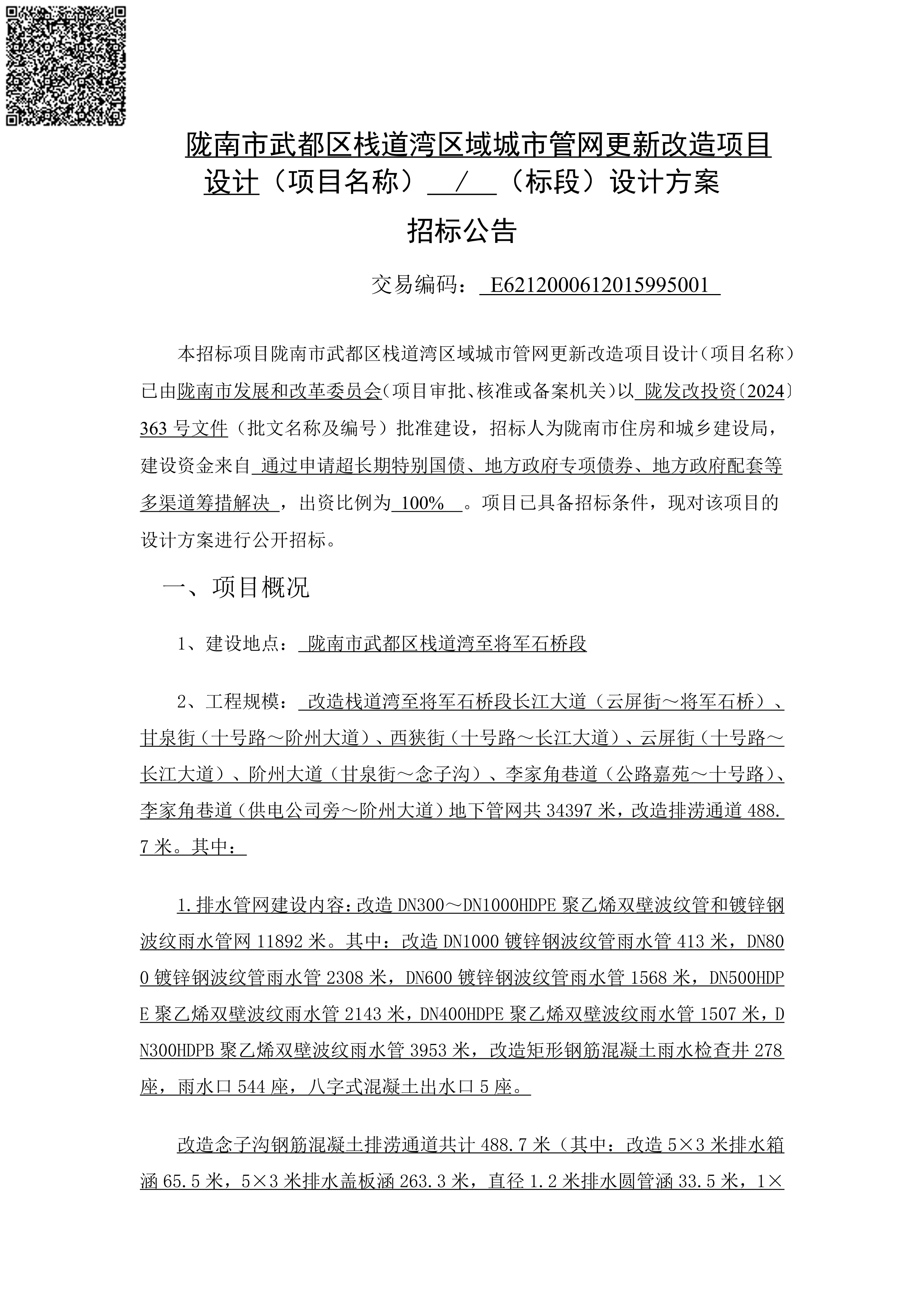 陇南市武都区栈道湾区域城市管网更新改造项目设计招标公告